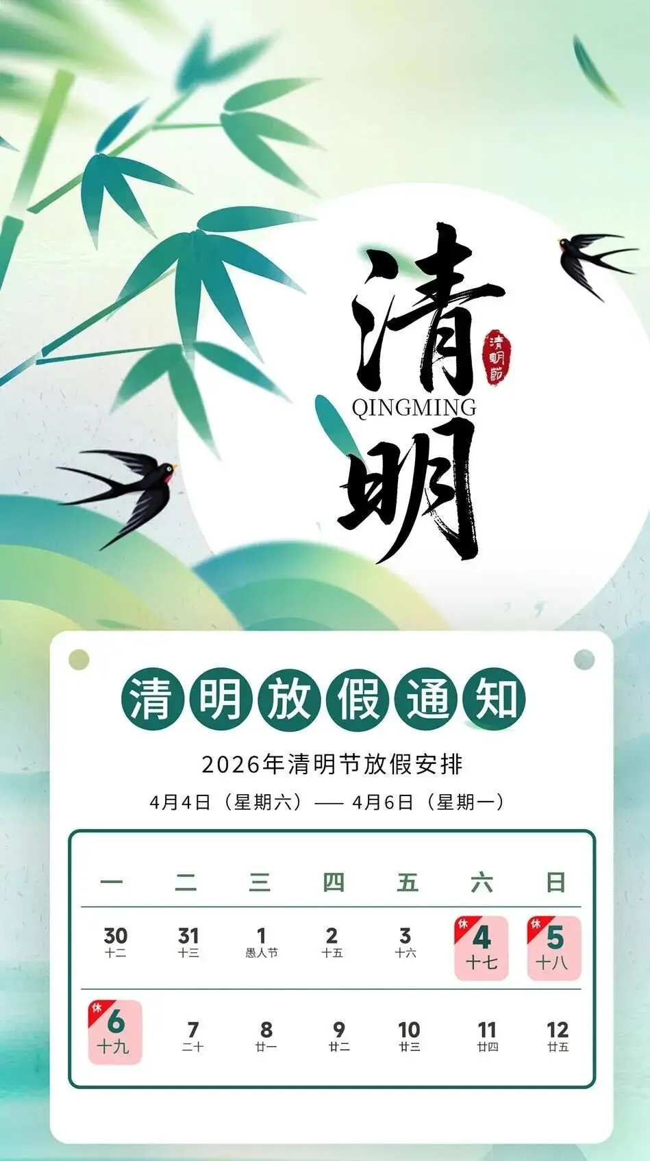 放假时间结合国务院办公厅2026年节假日安排通知,现将公司清明放假安排正式公布